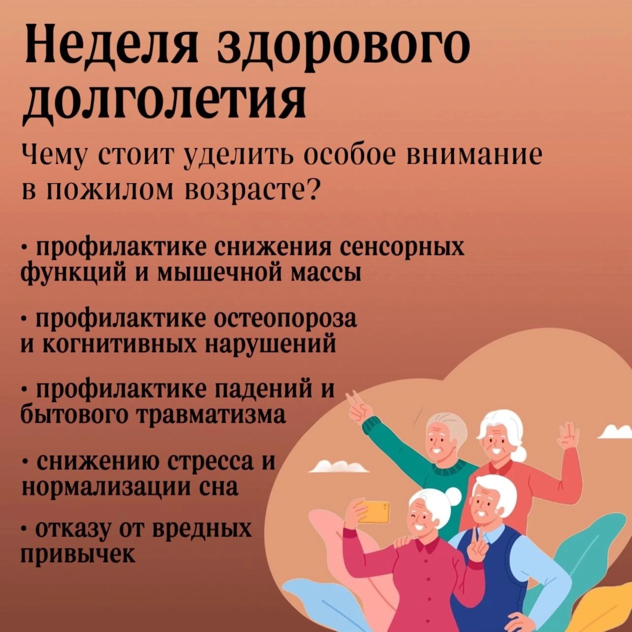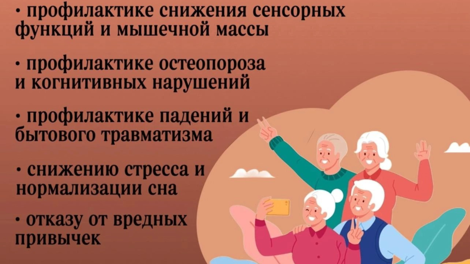 Жить долго, оставаясь здоровым и активным, – посильная задача. Для этого надо уделить больше внимания профилактике остеопороза, снижению функций зрения и слуха, когнитивных нарушений, а также падениям пожилых и бытовому травматизму.