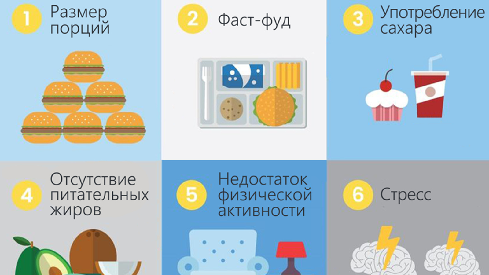 Основная причина ожирения - это нарушения пищевого поведения, которое закладывается родителями в детстве: предпочтение жирной, сладкой пищи, перекусы фаст-фудом, прием значительного количества пищи в вечернее время, большое количество перекусов в течение дня и во время просмотра телепередач, компьютерных игр.