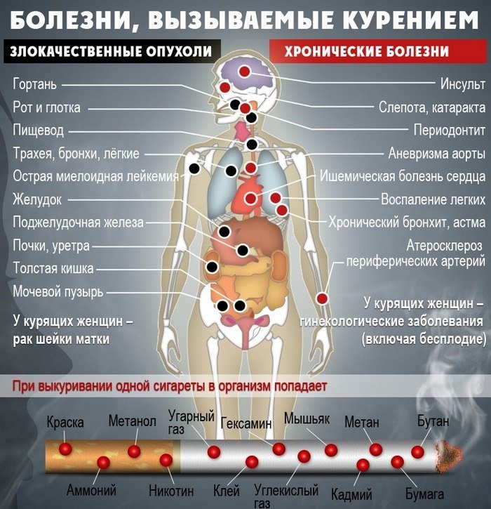 7 000 химических веществ: Каждый раз, когда вы закуриваете, в ваше тело попадает огромный коктейль из различных токсинов. Из них более 70 компонентов являются канцерогенами, то есть способны вызывать рак.