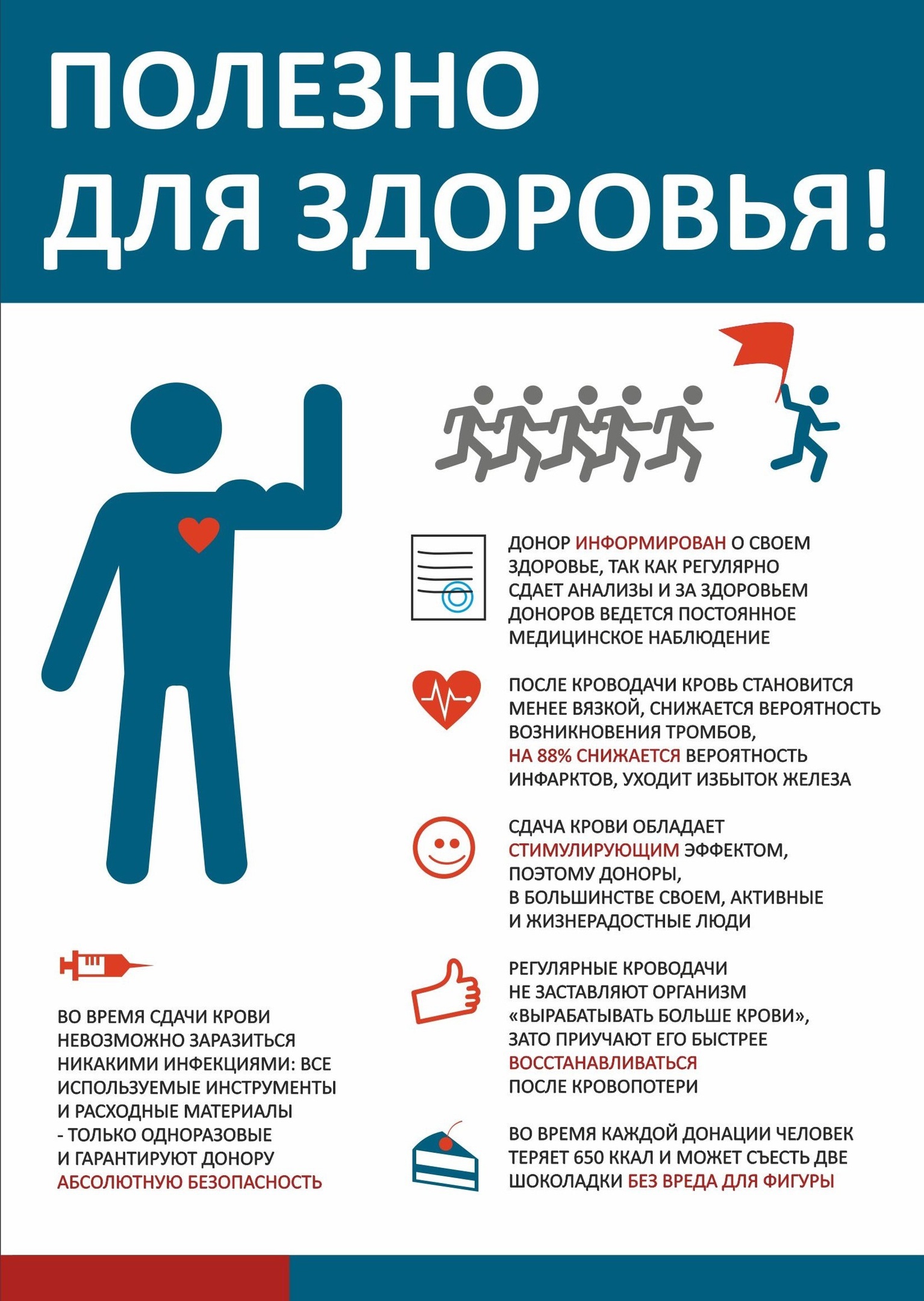 - У мужчин, сдающих кровь, риск инфаркта и сердечно-сосудистых заболеваний – в десятки раз меньше. Мужчины- доноры реже страдают приступами сердечной астмы.