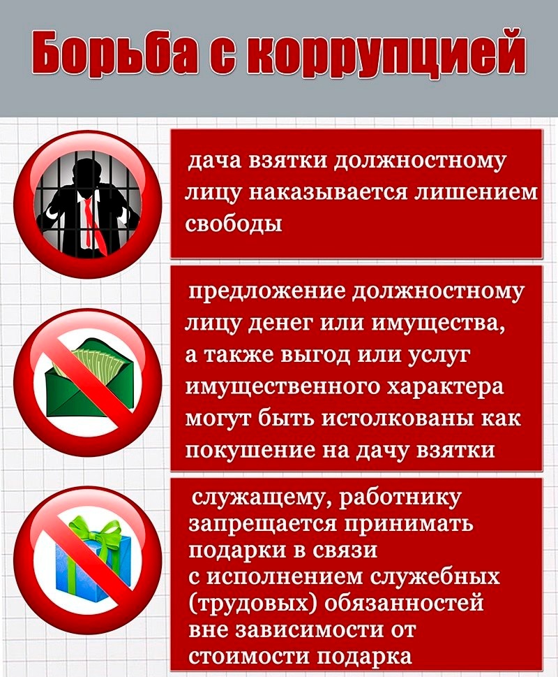 Коррупция – это злоупотребление служебным положением, дача взятки, получение взятки, злоупотребление полномочиями, коммерческий подкуп либо иное незаконное использование физическим лицом своего должностного положения вопреки законным интересам общества и государства в целях получения выгоды в виде денег, ценностей, иного имущества или услуг имущественного характера, иных имущественных прав для себя или для третьих лиц либо незаконное предоставление такой выгоды указанному лицу другими физическими лицами; совершение деяний, указанных в подпункте "а" настоящего пункта, от имени или в интересах юридического лица.