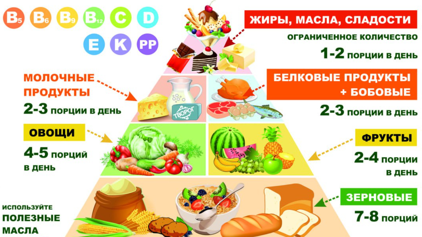 1.Для обеспечения организма клетчаткой и необходимыми витаминами половина ежедневного меню должна состоять из овощей и фруктов.