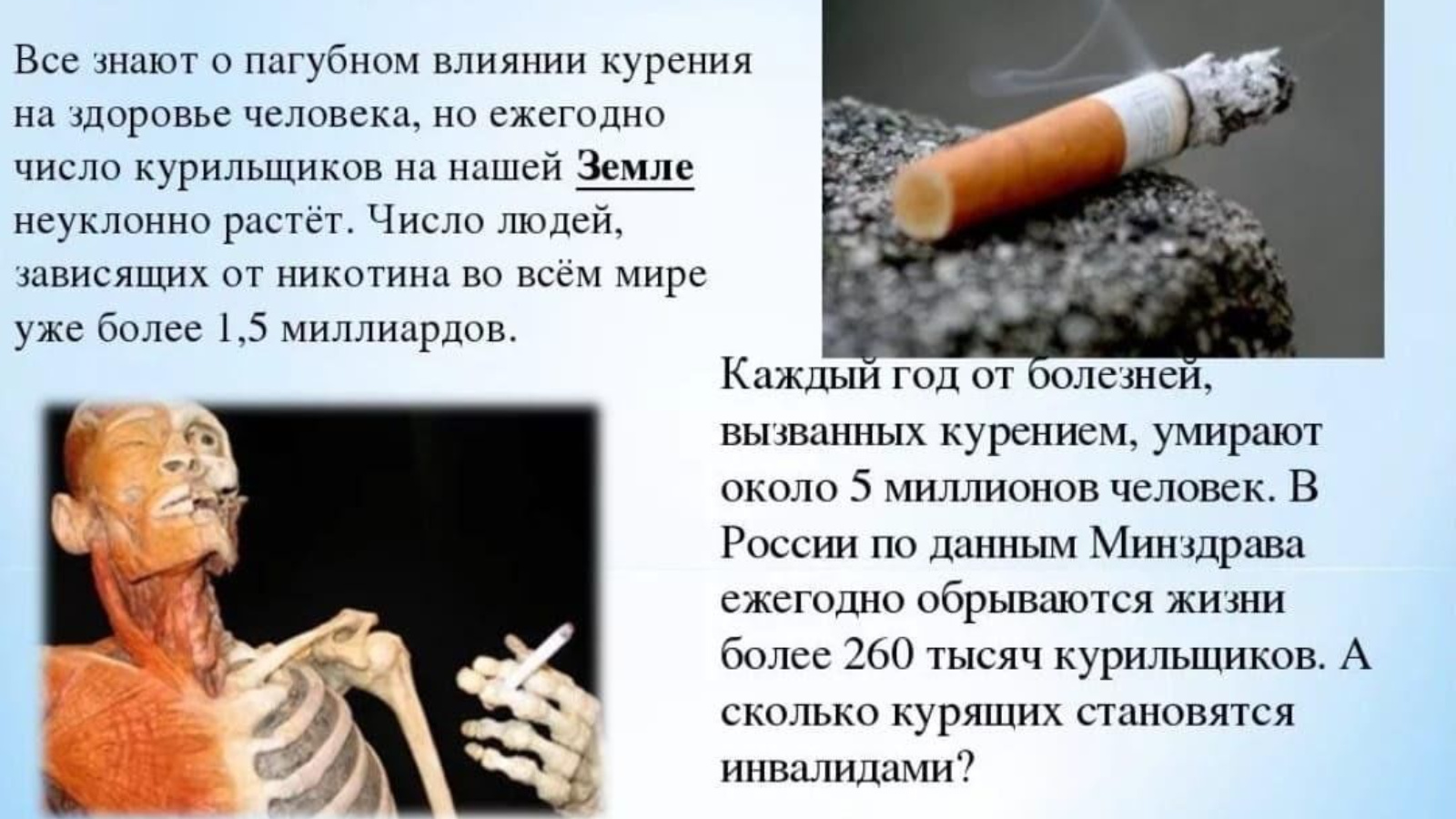 Табачная химия вредит всем органам без исключения. Потребление табака связано с возникновением не менее чем 25 заболеваний. Потребление табака считается наиглавнейшей причиной смертности в мире.