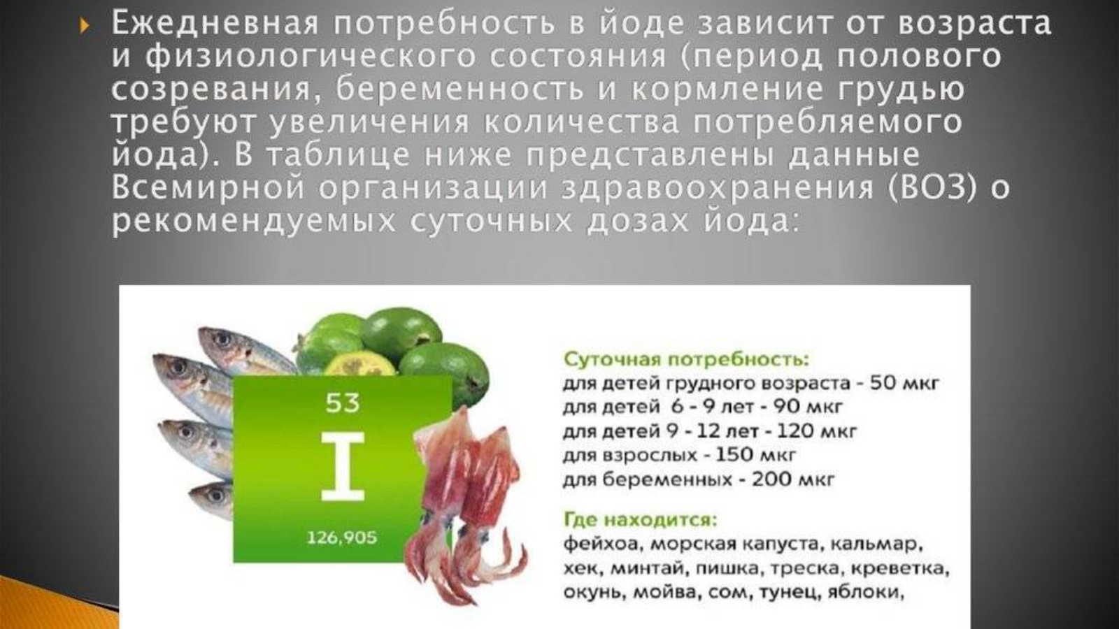 Бөтендөнья сәламәтлек саклау оешмасы тәкъдим иткән туклану продуктларында булган йодның тәүлеклек дозасы 120-150 мкг тәшкил итә. Бу микроэлементның иң югары концентрациясе диңгез һәм океан балыкларында, диңгез продуктларында һәм диңгез суүсемнәрендә.